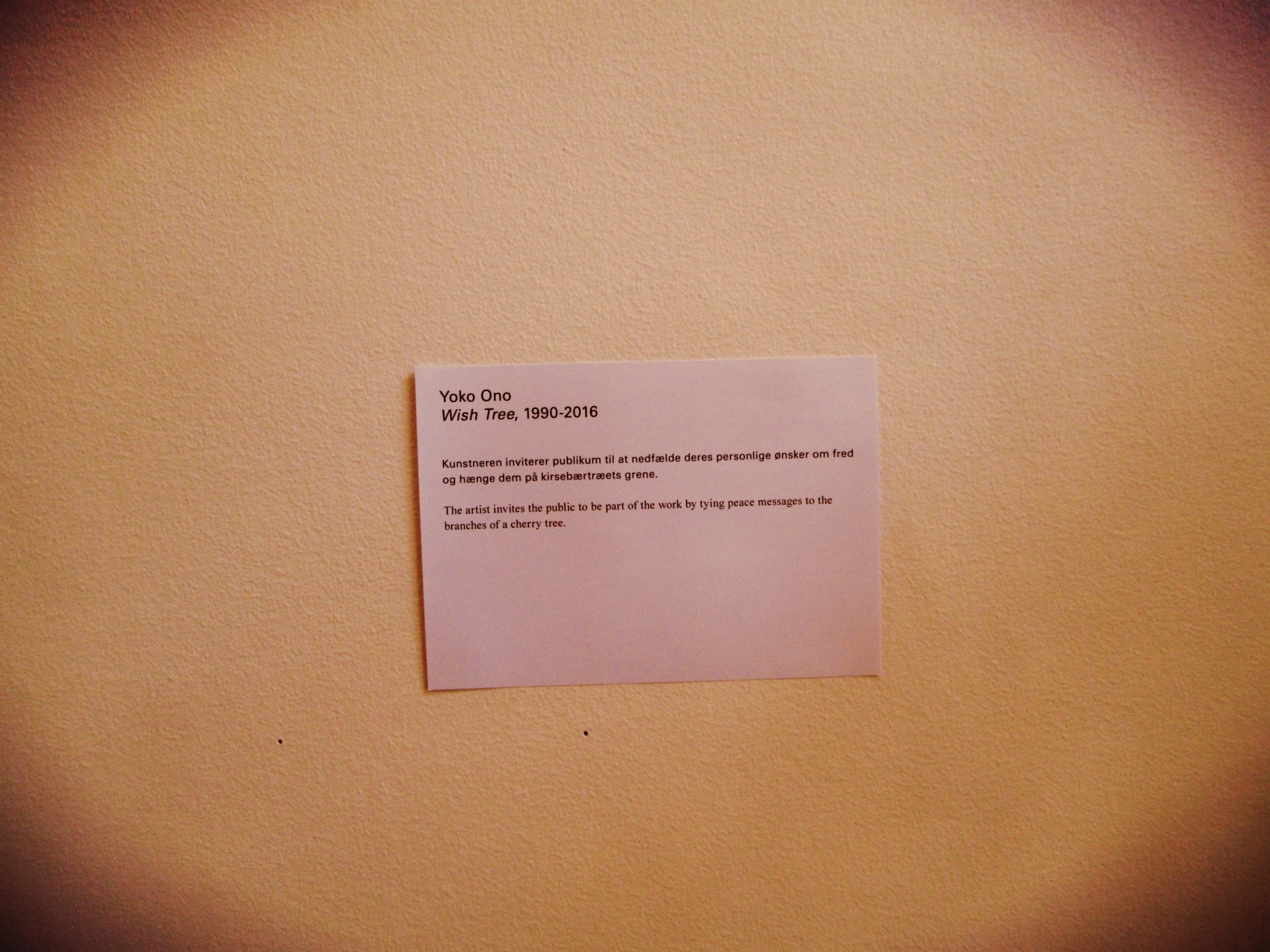Trei locuri le-am mai marcat în căutarea mea: Muzeul de design unde vezi de la scaune construite de danezi până la obiecte vestimentare din tot soiul de epoci, Charlottenborg unde au loc expoziții de artă – eu am avut ocazia să văd creații ale absolvenților de la Academia de Artă, expunerile lui Christian Boltanski din Take Me (I’m Yours), reprezentație care permite vizitatorilor să-și aleagă din obiectele expuse, artistul mergând pe conceptul că arta e gratuită și aparține publicului, dar și copacul lui Yoko Ono, Wish Tree, unde poți lăsa propria dorință.